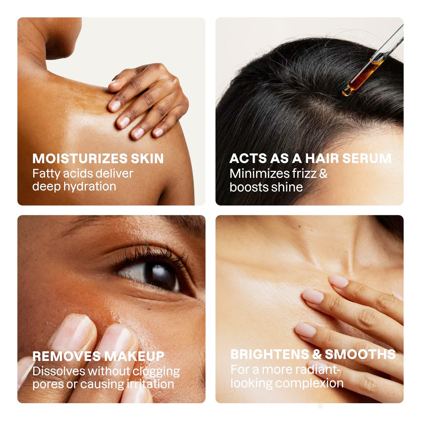 For Hair: Apply two to four drops to your hair (wet or dry) to smooth frizz, boost shine, and promote healthier-looking strands. You can also create a lightweight hair oil or an ultra-gentle glow serum by blending a few drops of it with jojoba or squalane, and smoothing it through damp ends.
